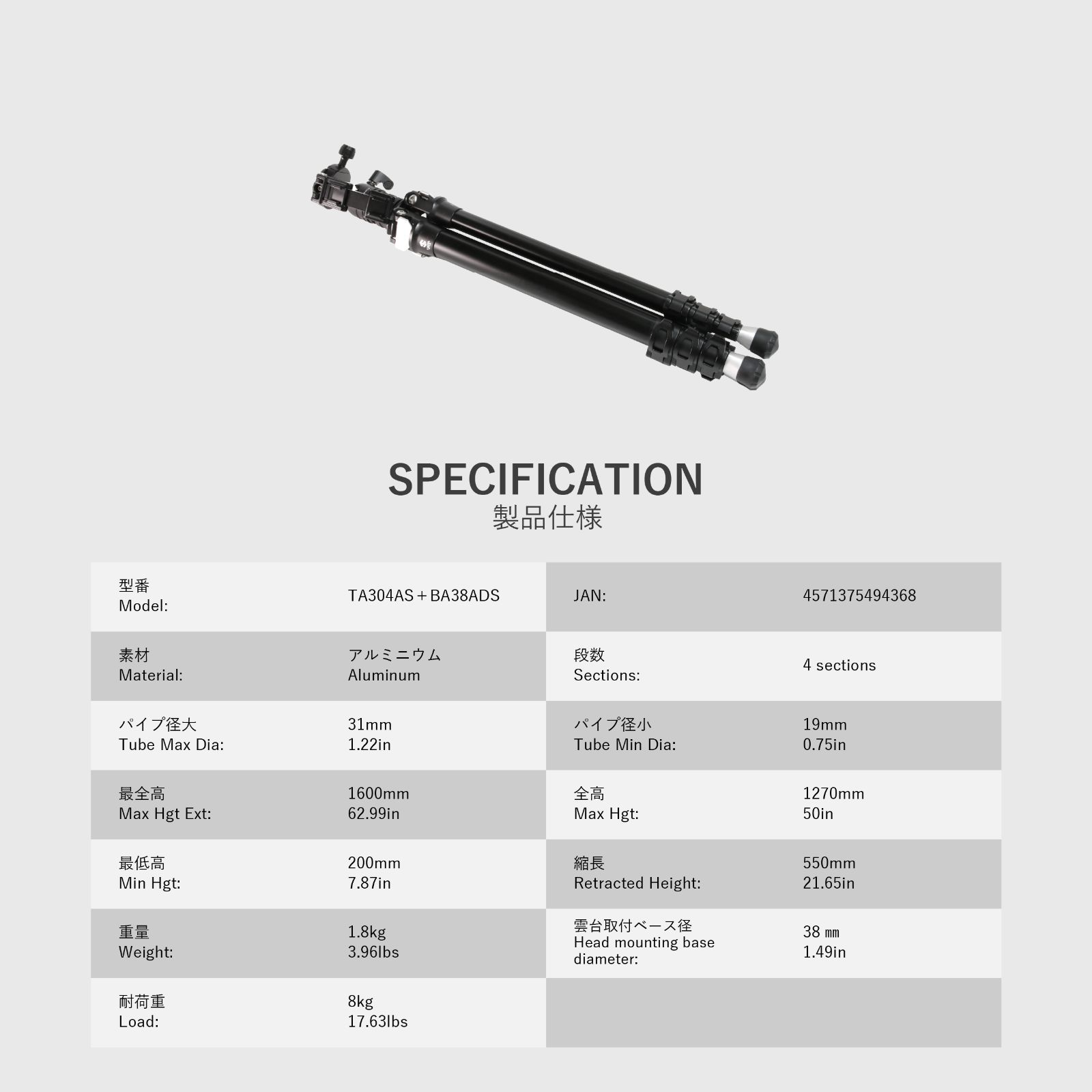 「TA304AS+BA38ADS アルミ4段三脚スマホアダプター付雲台セット」は、
