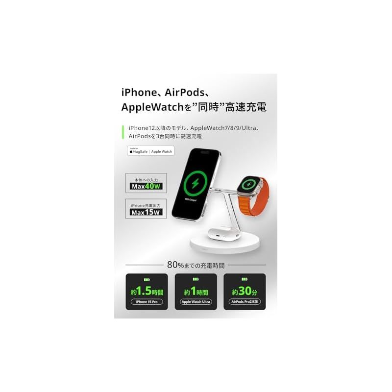 【急な予定にも対応できる高速充電】15Wの高速充電が可能なMagsafe対応のワイヤレス充電器なので、お出かけ前のちょっとした充電でiPhone/Apple Watch/Air Pods、3つのデバイスが1日中使用可能。忙しい毎日で充電を忘れてしまっていても安心です。