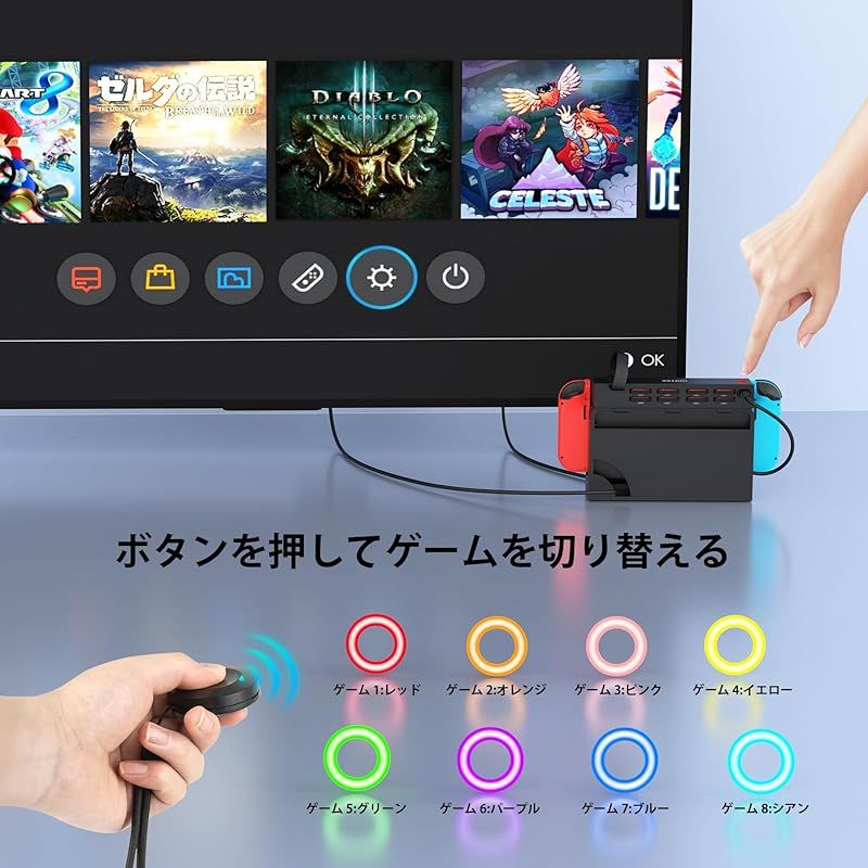 【ワンボタンで切り替え】Switchドック本体まで切替ボタンを押しに行っていた不便さも、リモコンで手元で操作できるようにかなりのバージョンアップを施しています。1つのボタンで、8種類のゲームを直接切り替えることができます。ボタンを押すだけで、LEDインジケーターの色が変わり、ゲームが切り替わります。