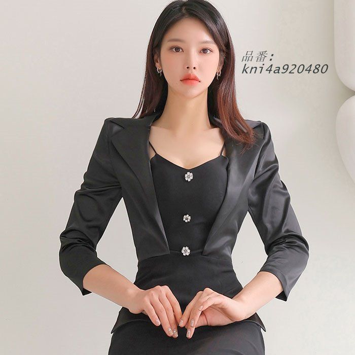 重ね着風ジャケット仕立て 五分袖ショートタイトワンピース 黒 キャバ スナック スーツ 韓国 タイトミニ kni 4 a 920480