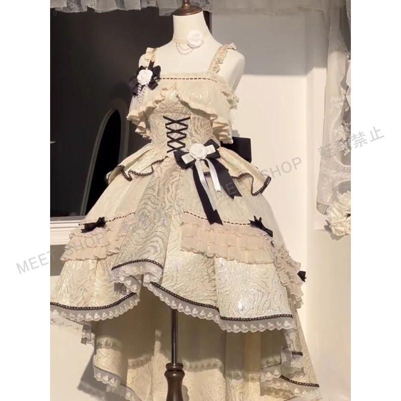 ワンピース ロリータ フィッシュテール リボン レディース ゴスロリ ロリィタファッション 花嫁風 フリル 肩出し ハイウエスト エレガント 上品 豪華 AラインCLF 099