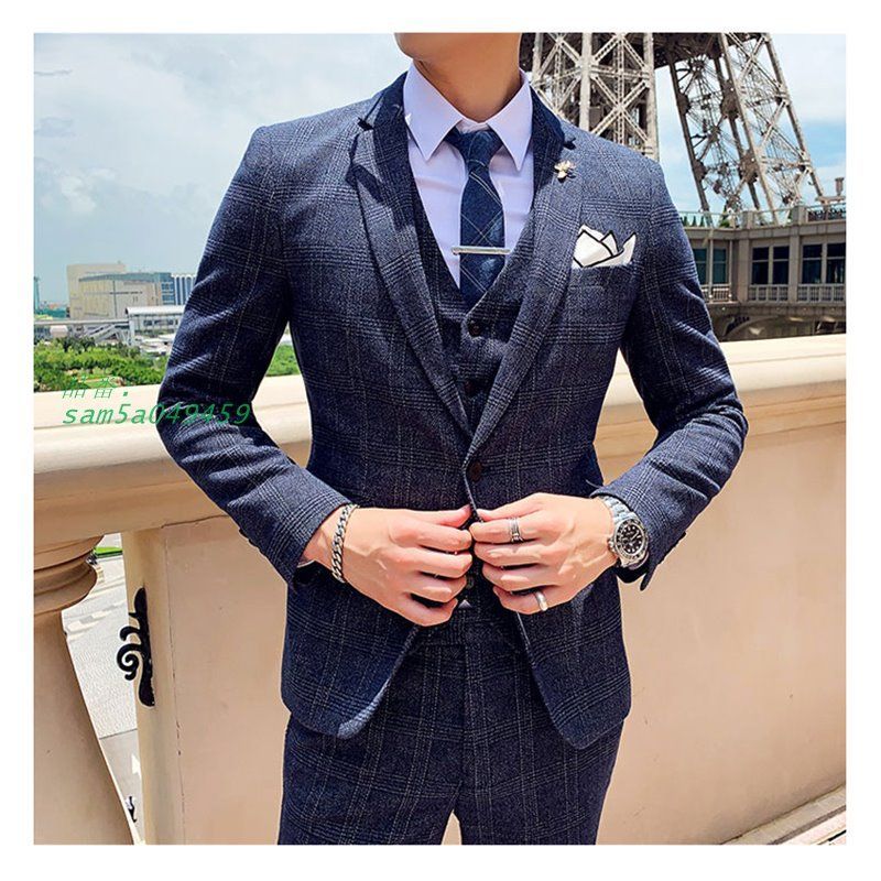 細身 スリムスーツ ワンボタン スーツ 3ピーススーツ ビジネススーツ チェック柄 3点セット