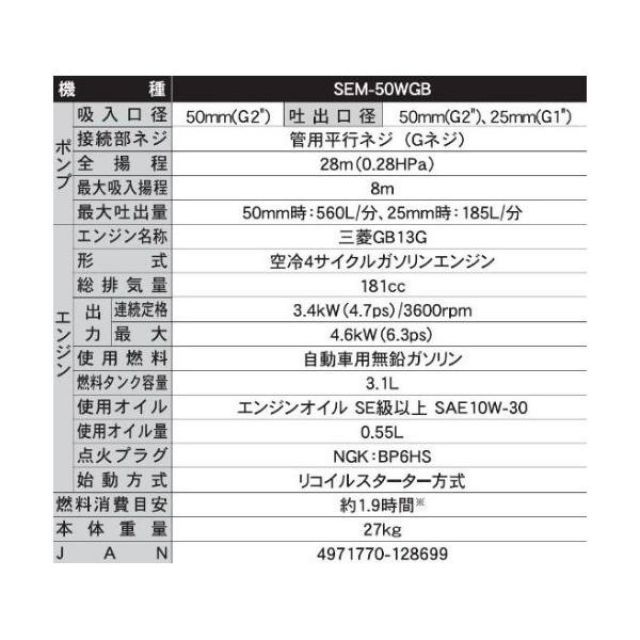工進 KOSHIN 4サイクル エンジンポンプ ハイデルスポンプ SEM-50 WGB 50 mm 2インチ ミツビシエンジン搭載