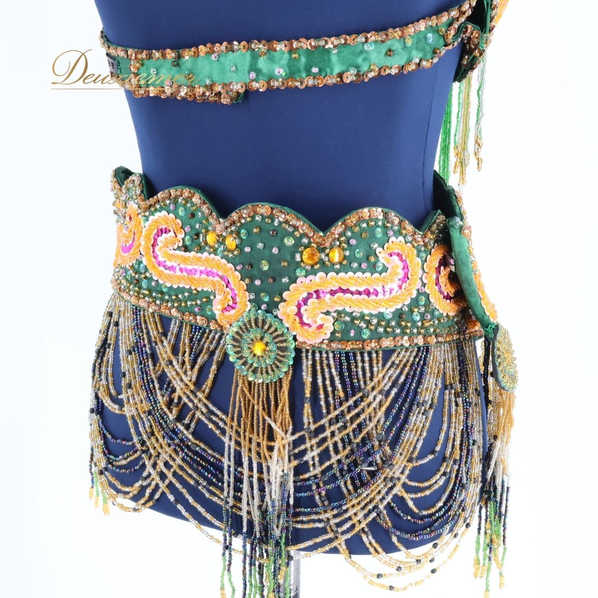 ベリーダンス用 オリエンタル衣装 グリーン スパンコールラメ ビーズ 豪華 ラメ 緑 オレンジ 煌びやか ゴージャス 重量感 トップス ベルト ブラトップ ダンス ダンスウェア エレガント レディース 女性用 キラキラ 派手 かわいい きれいめ 映え