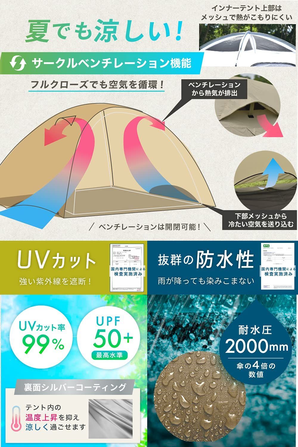 ✅【抜群の紫外線カット / 雨水を通さない防水性】生地には耐久性に優れた190Tのポリエステルを採用!裏面には遮光性を高めるシルバーコーティングが施されてるため、日焼けの原因となる紫外線を99%カットし、紫外線遮蔽率はUPF50+を実現。いかなる天候にも耐え、色あせやひび割れ、摩擦に強く、強度、耐久性を備えています。【耐水圧2000mm】テントの性能を表す耐水圧は大雨に耐えられる2000mmもあるので、急な雨や夜露で生地が濡れる心配もありません。また通気性もよく、湿気は適度に外に逃すため、悪天候対策と快適な居住空間の確保を同時に叶えます!